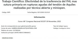 In55 Efectividad de la trasferencia del FHL mas sutura primaria en rupturas agudas del tendón de Aquiles realizadas por técnica abierta y miniopen. mayo 9, 2023 Ver más