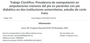Li65 Prevalencia de reamputación en amputaciones menores del pie en pacientes con pie diabético en dos instituciones universitarias, estudio de corte transversal mayo 9, 2023 Ver más